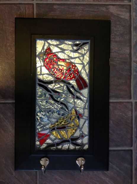 Usted puede también mosaico en un espejo! Me gusta usar cristal en un espejo para los fondos para un efecto realmente (véase mis cardenales en el cuadro 3). Como mosaico en vidrio, deje tiempo secado extra después de pegar con pegamento de Weldbond.