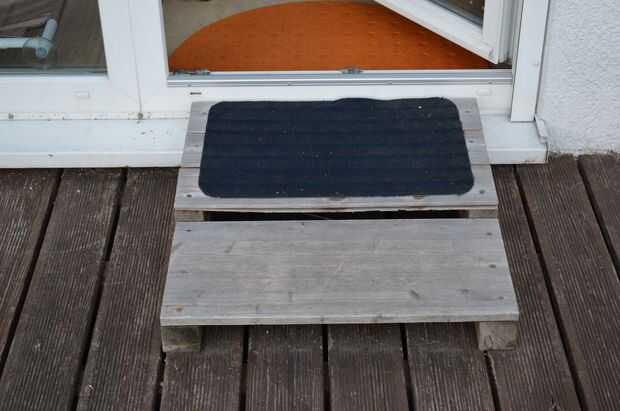 Hubiera sido igual de fácil de usar martillo y clavos, pero prefiero los tornillos. Así, con mi taladro de batería confiable, alineados los bordes del tablero inferior con la parte posterior de la 2x2s. Viró hacia abajo realmente rápida para asegurarse de que todo quedaría en el lugar. Luego puse el paso inferior contra la cubierta contra el marco de la puerta. Usando esto como un marcador, ponga los soportes superiores en su lugar, celebró junto con un tornillo más pequeño y utilizar tornillos largos para poner todo junto. Mi esposa nos encontró una estera al aire libre por lo que podemos limpiar nuestros pies que vienen dentro.