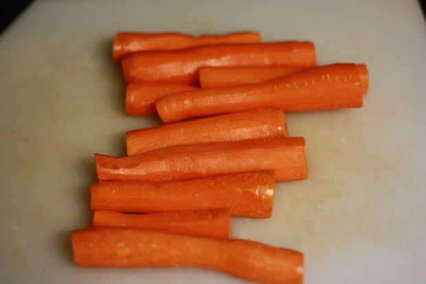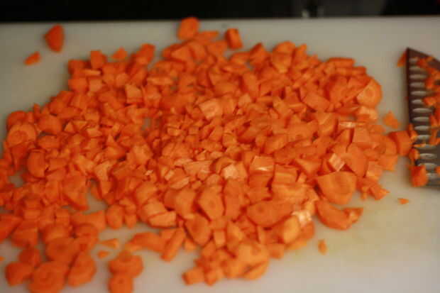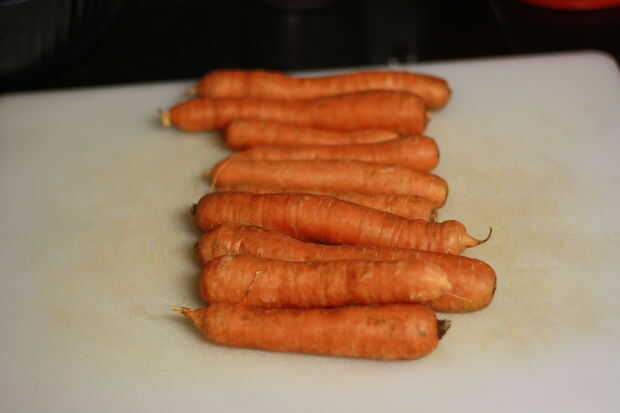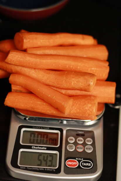 Lavar, pelar y picar las zanahorias.  A menudo pesan las zanahorias para ayudarme mejor estimar cuánta sal y ajo para añadir.  En las imágenes, estoy usando alrededor de medio kilogramo.