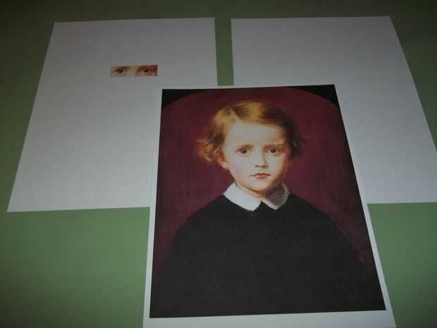 Utilizando el software de gráficos, formato de la imagen a la página. Guardar el documento. Luego guarde el documento nuevo con un nuevo nombre. En la segunda foto, recortar todo menos una caja alrededor de los ojos. Esta caja debe se extiende sobre 1/4" o más alrededor de los ojos en el exacto mismo lugar en la página. Usted puede simplemente usar una segunda copia de la imagen, pero sólo me gusta imprimir los ojos para evitar que la tinta desperdiciada.