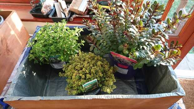 Para las cajas de vino, dio estos dos capas valla mancha demasiado, y parecían listos para ir! Sin embargo, es mejor poner una guarnición en la caja para verificar que la madera no conseguir demasiado encharcada y la putrefacción y para evitar que la planta raíces escape por los costados! Mi supermercado local vino al rescate otra vez, con una lona de 1m cuadrado por £1. Compré dos, y estos fueron con grapas en las cajas de vino. Por último, para dar a las cajas de algún drenaje, perforé seis agujeros en la base de la caja, haciendo coincidir con los huecos entre los listones en los estantes. Para detener la tierra se escape por los agujeros, rocas porosas se colocaron encima de los agujeros y entonces demasiado lleno con suelo.