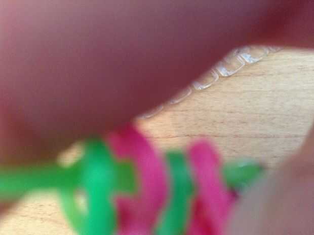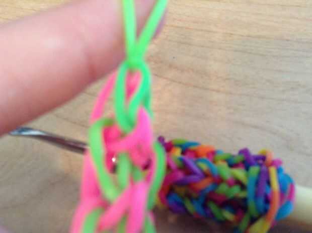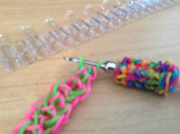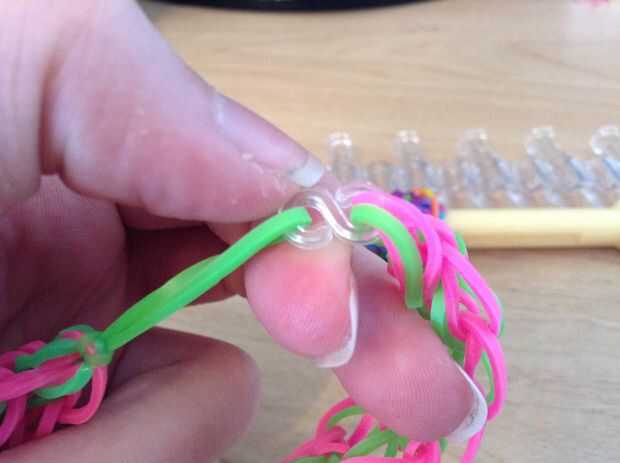 yaaPaso 1: Vas a necesitar:telar del arco irisGanchoBandasClip CPaso 2: Agarrar una banda y empieza de la clavija central en la clavija correcta, luego volver a la clavija media. Repita el proceso hasta que usted alcanza la parte superior.Paso 3:Dale