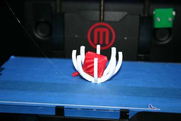 Cuando la bola de"agujero" es 60% completado (impresión sin apoyos), pause la impresora (llamada para carga del"filamento" en máquinas de MakerBot) e inserte la escama tan baja como sea posible.
