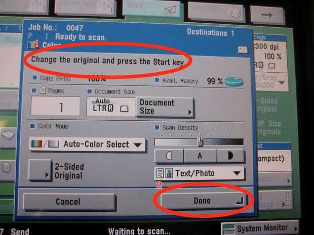 Como se indica en las instrucciones (1), puede cambiar su original y pulsa Start otra vez o usted puede simplemente presionar "Done" (2).