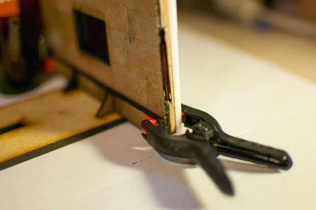 El titular de la cámara se construye pegando el tablero largo horizontal a la pequeña franja vertical usando los triángulos pequeños. Es importante asegurarse de que las dos juntas se pegan en un ángulo de 90 º.
