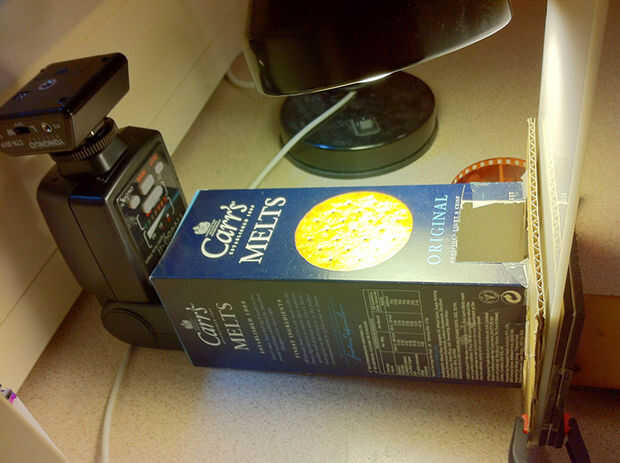 Generalmente Coloque el flash en unos 30cm de la película y hacerla disparar a través de una caja de cartón para que la luz no salpicar todo sobre el cuarto y provocar reflejos no deseados en la película. Me han cortado también un pequeño agujero en la caja de cartón y colocar una lámpara sobre ella para tener algo de luz brillar a través de la negativa y hacer mi vida más fácil al enfocar.