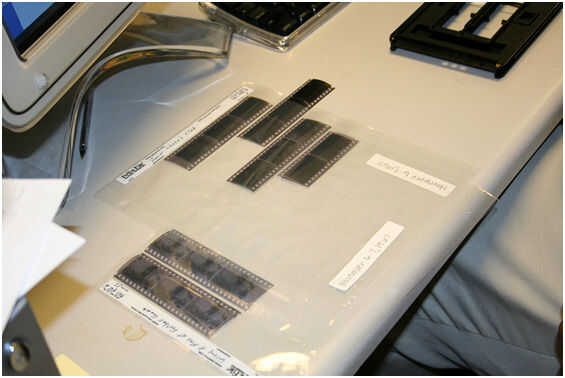 Ahora debe haber uno o más mangas sobre la mesa con negativos medio fuera de las mangas.