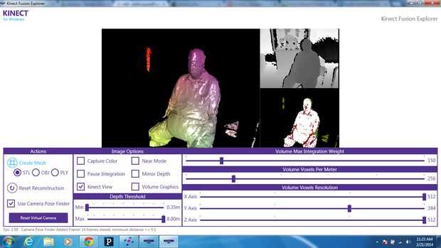 Para capturar una malla de 3 dimensión de ti mismo cintura para arriba, frente y parte posterior, sólo abren la aplicación Kinect fusión explorador WPF, sentarse frente al Kinect en un taburete, pulse el botón de "reset" en la aplicación de fusión de Kinect (esta es la parte que requiera una mano extra porque en cuanto pulsas reset debe mover lo menos posible). Cuando la pantalla muestre una buena imagen 3D de ustedes (ver figura 1), comenzar a girar lentamente hasta que se han convertido a 360 grados y el Kinect ha explorado completamente te (véase cuadro 2), momento en el que pulsas "crear malla" (otra vez en que sería mejor para un amigo a ayudar).