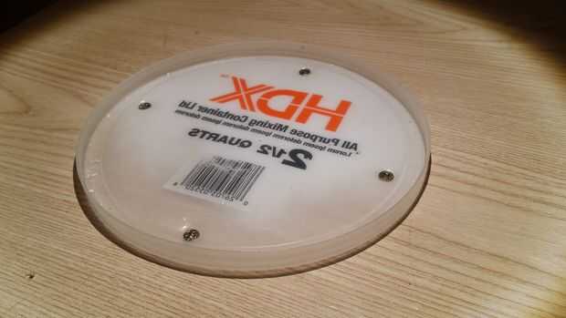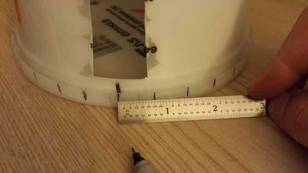 Preparando la tapa es un broche de presión en comparación con el cubo. Empezar haciendo 30-40 marcas espaciadas uniformemente alrededor de la tapa con el marcador. Para mi tapa, usé una distancia de 3/4" entre las marcas para hacer 30 marcas. Si está utilizando una tapa de diverso tamaño, sólo recuerda: perímetro = pi x diámetro