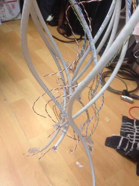 Conectar 40 ordenadores con ethernet y alimentación iba a ser desordenado, pero quería hacerlo tan eficiente como sea posible. Lamentablemente la frambuesa PI no es compatible con Power-over-Ethernet, así que tuve que hacer este mismo. Cortar 40 cables ethernet, cada 5 metros de largo. Mantiene todos los cables de la misma longitud para saber que voltaje lo que perdería más de esta distancia sería igual para todos y poder ajustar esto de la alimentación para conseguir un 5v muy precisa.