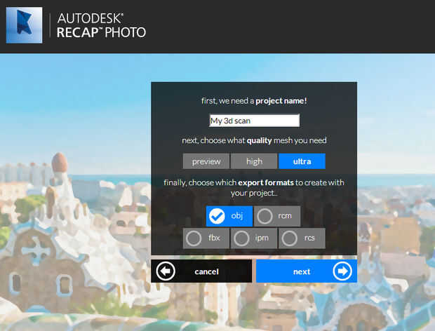 Después de que haya iniciado sesión a recapitular, haga clic en el botón nuevo proyecto. Aquí puede seleccionar la calidad de su modelo 3d (siempre elegir Ultra, por qué conformarse con baja). Para el formato de exportación, más 3d software de la impresora puede trabajar directamente con archivos .obj, así al menos seleccionados aquél.