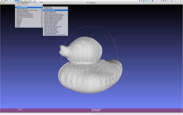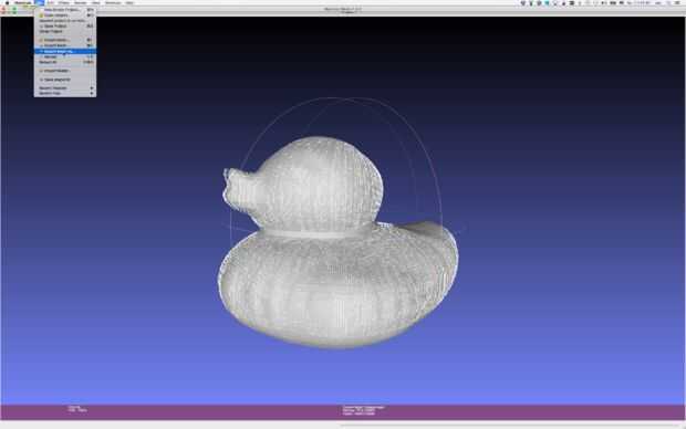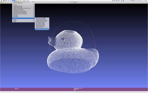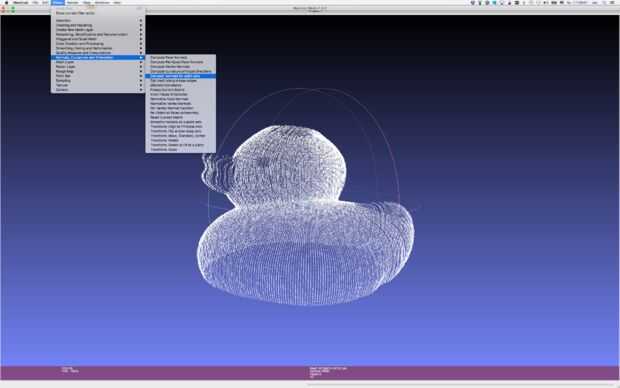 Para transformar el pointcloud un imprimibles fichero STL uso MeshLab (al menos hasta que se integra en el software de FabScan:-): solo descargar el archivo .ply de la Pi a tu ordenador (botón derecho en la ventana del navegador FabScan) e importarlo como una malla de MeshLab. A continuación, utilizar varios pasos en el menú filtro: