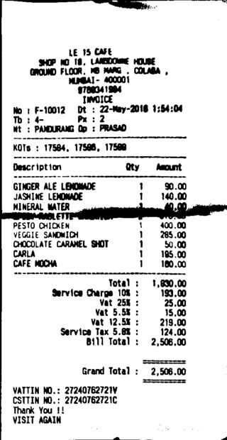 El programa de salidas de un reconocimiento después de la terminación de cada paso en la terminal de comandos. Echa un vistazo en el video de la demo del programa como complemento de las medidas de ejecución mencionados anteriormente. También he incluido una imagen de un recibo que escaneé con este escáner.