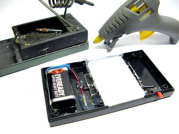 Seguir el esquema anterior. La soldadura de su batería, resistencia, interruptor y LED juntos.