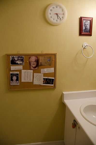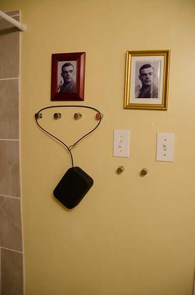 Colgamos una cortina de ducha vieja y 'Cerebro' pintado con pintura de aerosol roja en él. Solo por diversión, porque la palabra sí mismo no ayuda mucho en descifrar las cerraduras.