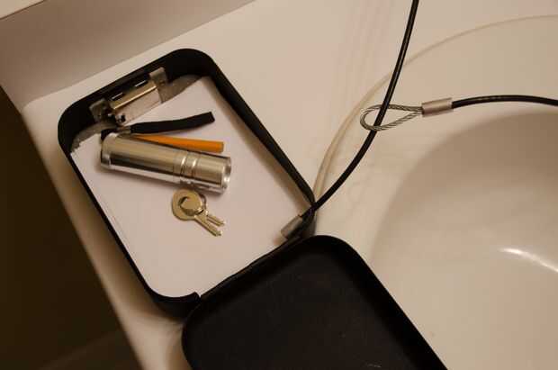 Contiene una clave para la parte inferior de gabinete bajo el fregadero, una linterna, un papel en blanco y un par de lápices.