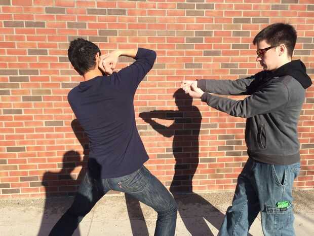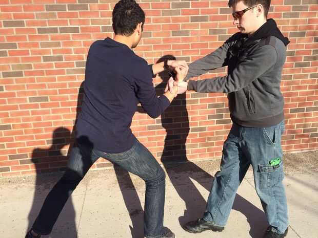 También se incorpora la segunda parte con las dos primeras fotos. Tienes que tirar de ambos brazos de manera vertical mientras se mantiene el bloqueo con el puño. Esto interrumpe la empuñadura de que su agresor tiene sobre usted.