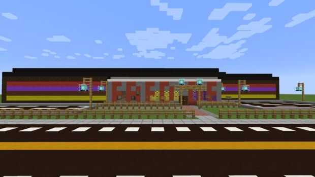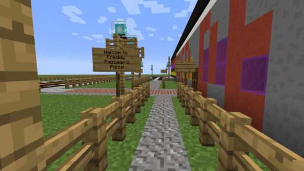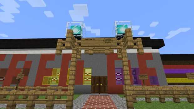Para decorar el exterior de la entrada, he añadido algunas paredes de vidrio con Chica, Bonnie y de Freddy colores. También intentó explicar "Freddy" en rojo teñido arcilla, sin embargo, soy no muy bueno con la construcción de letras por lo que puede parecer un poco raro.
