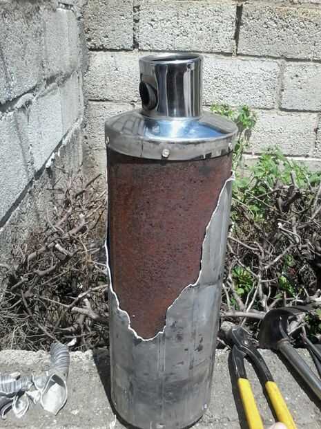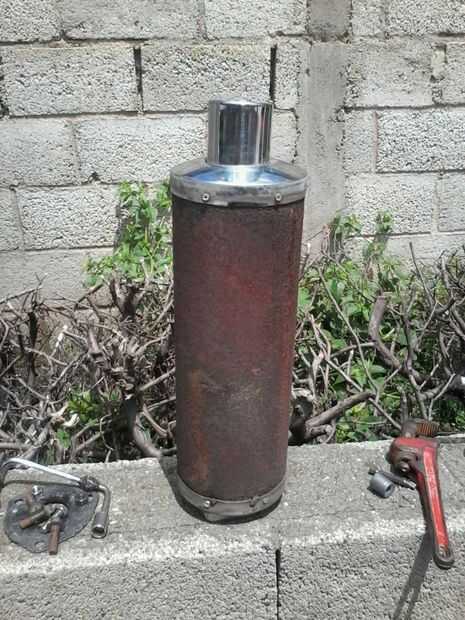 Con unos alicates, romper la cubierta de aluminio, entonces, tomar pequeños trozos hasta que la cubierta completa hacia fuera (esta cubierta puede ser recyclated en un centro de aluminio), como veis, el interior de los gases de escape tienen realmente demasiado óxido interior, esta pieza está hecha en hierro y el calor y agua hace un buen ambiente para crear la cantidad de óxido. Sacar con un taladro de que remaches de aluminio en la ronda, los agujeros son ideales para poner algunos tornillos.