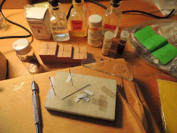 Preparar los insectos pasadores por poner la tarjeta en el pin usando el bloque de fijación para ajustar la altura de la tarjeta; entonces el microslide debajo. Poner una gota de bálsamo de Canadá en micoslide transparente. Dejar el pin de la placa de fijación (pernos preparados están en la placa de fijación).