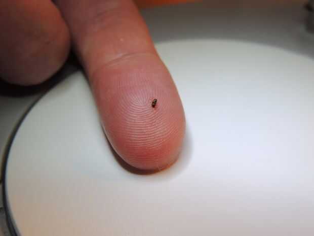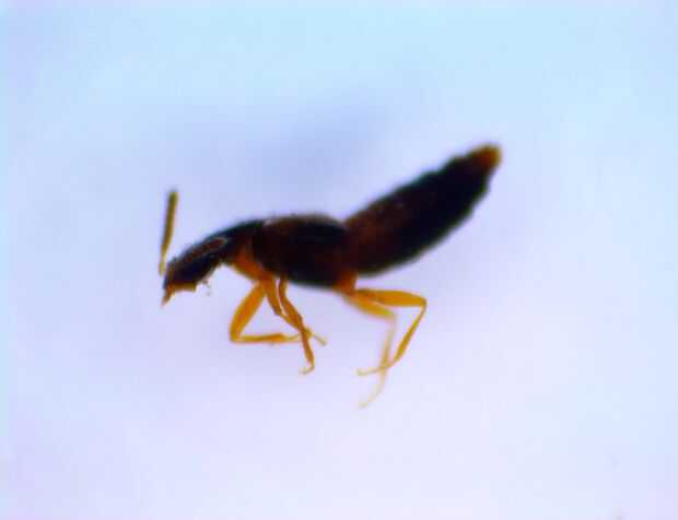 Tomar una muestra (aquí un Gyrophaena de 2 mm). Poner una gota de agua en un pozo en la placa de cristal y deposite a la muestra de escarabajo