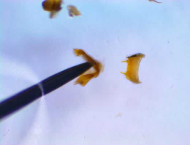 Si tienes una hembra aleochrinae encontrará un solo tubo (spermateca) mientras que el varón tendrá un tubo encerrado entre dos corchetes. Separar el corchete (paramers) del tubo (aedeagus) (la aguja aquí sostiene el aedeagus y paramers)