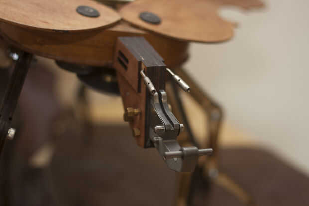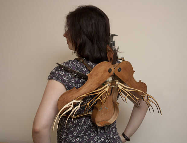 El cuerpo principal está hecho de un viejo violín cuya espalda era partir lejos del cuerpo, planeaba quitarse la parte de atrás por lo que pude pegar en, sin embargo la parte de atrás se salió luego en sus dos mitades y en un momento de inspiración decidí hacer esto.