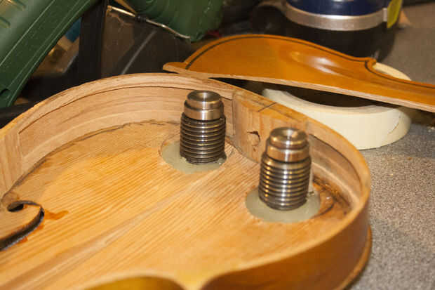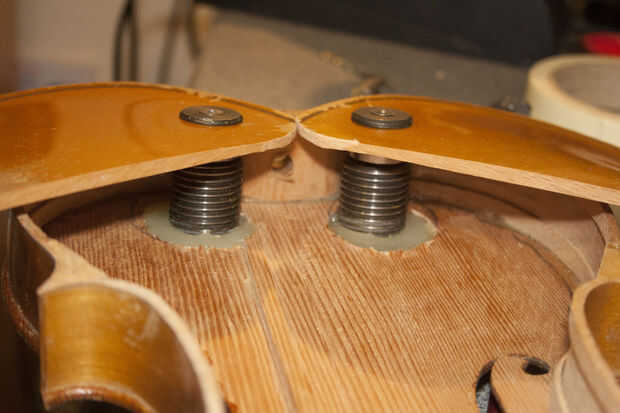 El truco para conseguir un ajuste perfecto con el caparazón al violín es poner las secciones de dos caparazón en el cuerpo y en su lugar con cinta adhesiva. Volcar parte del rodamiento debe sentarse sólo a través de los agujeros con un poco de un hueco en todos los lados.