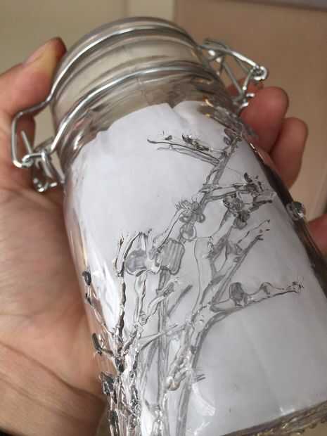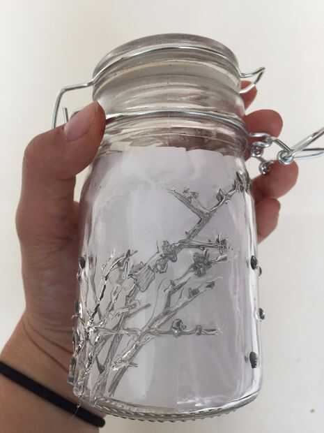 Tubo pegamento caliente en el frasco lo mejor que puede. Puede omitir este paso si no queremos un diseño de su frasco.