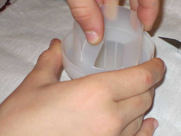 A continuación quiere cortar barras diagonales en la sección interior. Otra vez, revisa la imagen. Hacer los cortes hacia abajo cada media pulgada o tan alrededor de la tapa y entonces usted puede complemento a las piezas de.