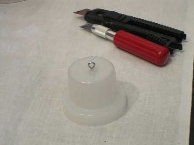 Para poner el gancho y el ojo en su lugar sujetando en el centro de la tapa. Coloque la tapa sobre una superficie lisa y gire la tapa. No trate de la torcedura del gancho y del ojo en la tapa, es muy difícil. Si girar la tapa y aplique presión hacia abajo sobre el ocular, irá justo en el plástico. Añadir un poco de pegamento caliente en el interior de la tapa, parte inferior de la pieza del ojo, para proteger el ojo.