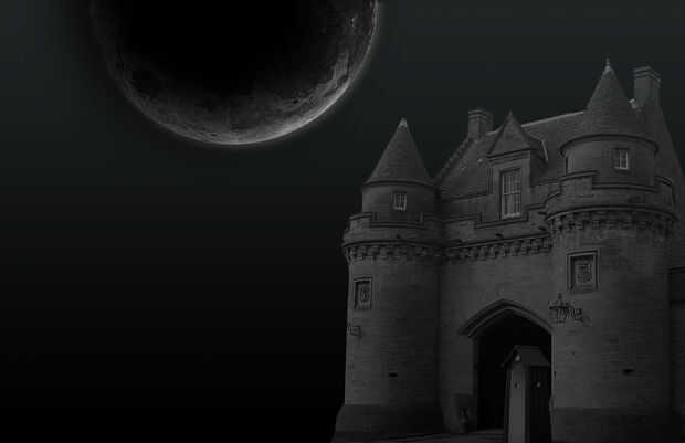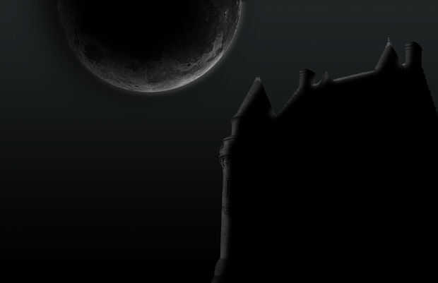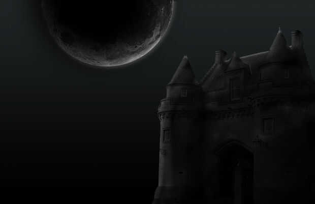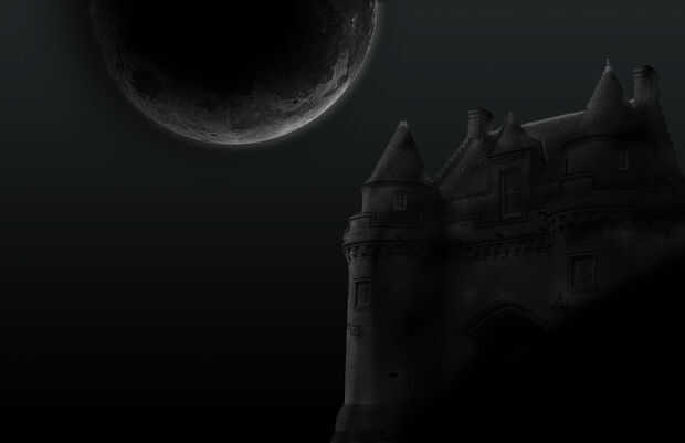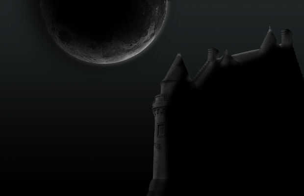 El castillo se ve bien, pero todavía necesita un poco de trabajo. Ctrl + clic en la miniatura del castillo para crear una selección alrededor de él. Crear nueva capa sobre la capa de castillo y llenan esta nueva capa de negro. Esta siguiente parte variará con cada uno debido al tamaño de la imagen. Utilizar mis números como referencia, pero recuerda que tuya probablemente serán diferentes. Seleccione la herramienta borrador y escoge un pincel redondo con un radio de 75 píxeles y una opacidad de 85. Golpear las esquinas del castillo donde golpeó la luna. Me gusta hacer solo los bordes mismos del edificio. Aún con la herramienta Borrador seleccionada, escoge un pincel redondo con un radio de 100 píxeles y una opacidad de 50. Hacerlo de nuevo con un radio de 150 y la opacidad de 25 y una vez más con un radio de 200 y una opacidad de 15. Cada paso debe conseguir más amplio y mayor hasta el castillo entero se expone, con los lugares que están más alejado de la luna, siendo el más débil.