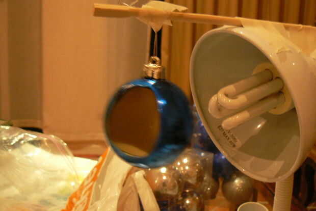 Pintar el exterior de su adorno blanco, y el interior cualquier color usted tiene gusto. Pinté mío una luz azul. Me pareció más fácil pintar la bola cuando no estaba sobre una superficie plana, pegadas a un palillo a mi lámpara, y había grabado el adorno para el palillo.