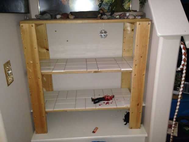 he utilizado un estante de tres estantes y azulejos de baño restos dispuestos para un piso de baldosas