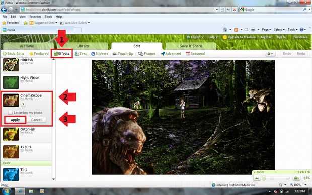 Ir a la pestaña "Efectos" y seleccionar la opción "CinemaScope". Desmarque la opción "Buzón mi foto" y haga clic en "Aplicar".