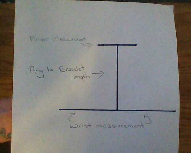 Una vez terminadas sus medidas, generalmente de cinta mi cinta métrica a mi superficie de trabajo para facilitar la consulta, pero también se puede dibujar una guía para ayudarle a planear su pieza. Use su cinta métrica para marcar cuánto cadena usted necesitará hacer su anillo, pulsera y cadena de conexión.