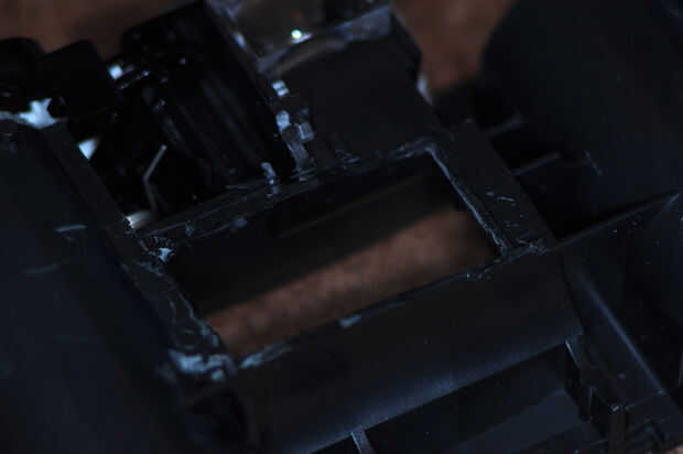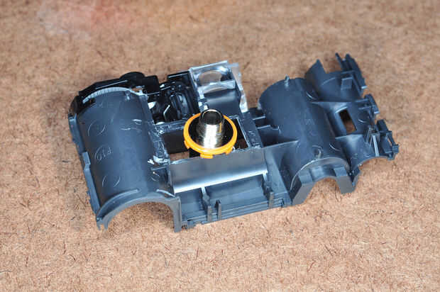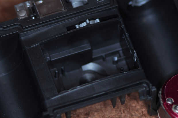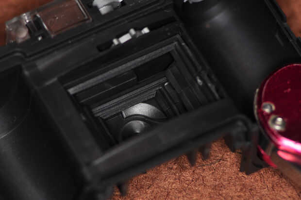 ¼" gato se extiende desde la parte delantera, a través de la estructura interna en la cavidad de la exposición. Sala debe hacerse a ello. Desde atrás, use alicates para quitar el escalonado piezas de plástico que recubren la cavidad de la exposición. Desde el frente, utilice un cuchillo para quitar el bloque que llevó a cabo el montaje de abajo del lente. Compruebe a la toma de ¼" para el ajuste.
