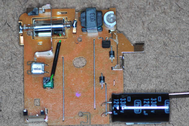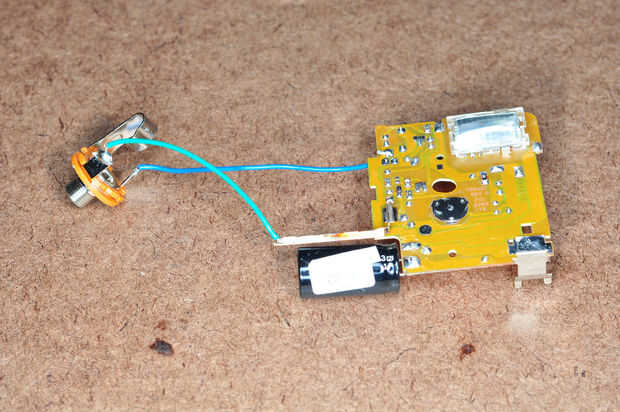 La soldadura 2" pieza de 22g de alambre en el orificio donde se extrajo la placa. Suelde una segundo 2" pedazo de alambre de 22g en la barra de metal. Ahora puede probar el circuito por la instalación de la batería y presionando el botón en la parte delantera. Otra vez aquí debe el gimoteo de condensador se está cargando y después de unos segundos deberá encenderse la luz indicadora del flash. Asumiendo que los cables tienen extremos desnudos, tocamos juntos y debe activar el flash. Retire la batería y los otros extremos de los cables a la toma de ¼" de la soldadura.