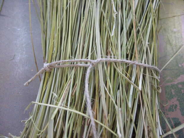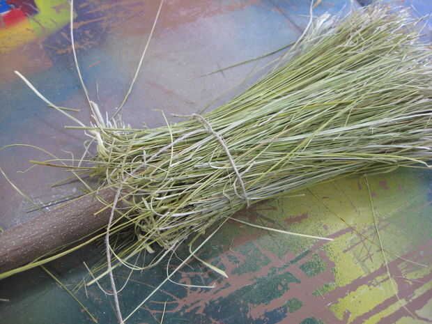 Deslice el extremo de lazo bajo el paquete de cerdas y palillo, sobre a medio camino entre el extremo del palo y la parte superior de las cerdas y pase el extremo largo de la cuerda por el extremo.