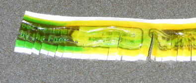 Quitar la envoltura. Inicio desentrañar el caramelo y cortar la fruta por el pie en dos pulgadas largo. Dejar el papel. Luego cortar flecos finos el pedazo largo de dos pulgadas. (Si un niño muestra cómo hacer esto, les puede dar tijeras amable niño, y puede cortar el resto de las franjas)