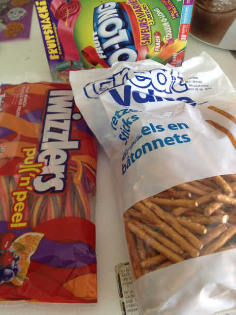 Tomar 1 porción corte y coloque un palito de pretzel en él y doblar de un lado a otro como se muestra en la primera foto, pulse para pegar.