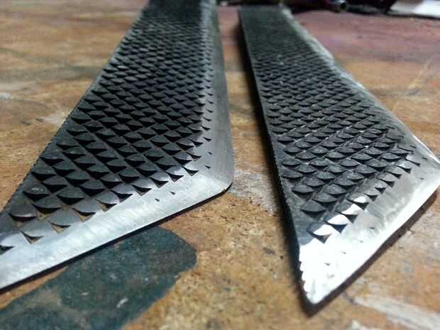Mi abuelo es un veterinario, y cuando él se enteró que me metí en herrería hace un tiempo, me mandó un puñado de herrador raspadores para jugar con. Naturalmente, mi primera inclinación era hacer cuchillos fuera de ellos, pero no tengo nada bueno para hacer las asas con. Sin embargo, eso cambió cuando mi papá corte un árbol de pimienta en su lugar hace unos meses. Árboles de pimienta son mi tipo favorito de los árboles, por lo que salvar tanto de la madera como he podido conseguir, y varios pedazos fueron sólo la forma derecha para manijas.