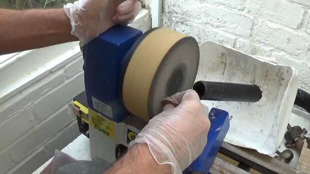 se puede hacer con un simple pedazo de papel de lija, una herramienta dremel, una lijadora de grano o en el Banco con un grano fino. Aquí me he pegado una lija 240 a una placa de madera en mi torno.