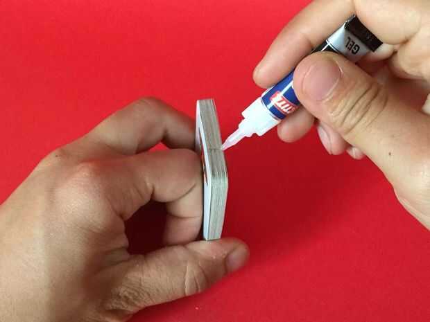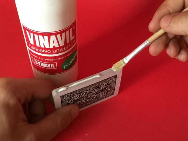 Tomar la cubierta más grande y una pequeña cantidad de un potente pegamento (como el ataque) se aplican a cada lado. Esto le ayudará a aplicar un pegamento transparente (como vinavil) en toda la superficie de las fronteras. (foto #3)