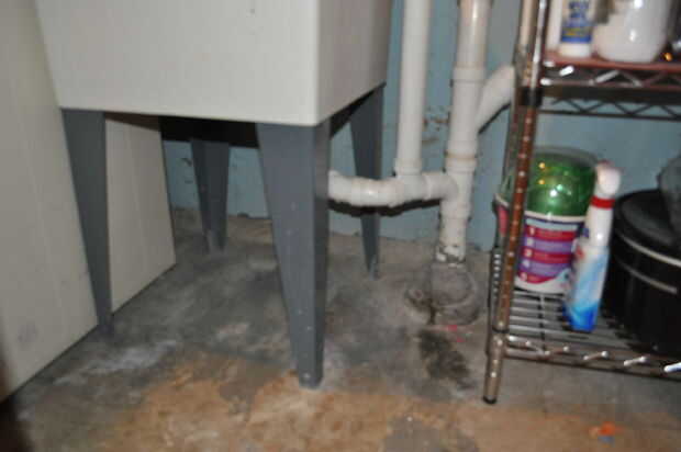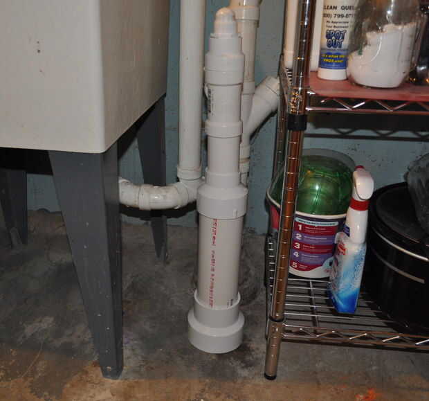 Encontrar un lugar cerca del fregadero de utilidad donde puede colocar el tubo de drenaje PVC falso.  Encontré un lugar cerca de un montón de tuberías al lado de la descarga real.