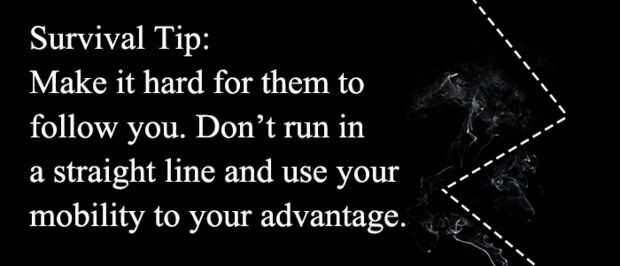 ~ Cuando está siendo perseguidos a través de una zona densamente boscosa, no se ejecutan en línea recta, hará más fácil para los perseguidores que te siga.