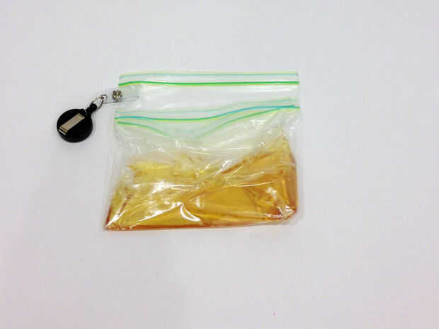 Coloque la bolsa en una o dos bolsas más como en la imagen y colocar algún tipo de cuerda a la bolsa exterior. Usé un titular de la placa puesto que era conveniente, pero tienes un cordón, hilo o lo que sea útil debe funcionar. Debe ser entre 8"- 12".