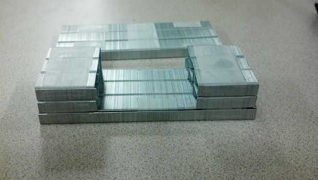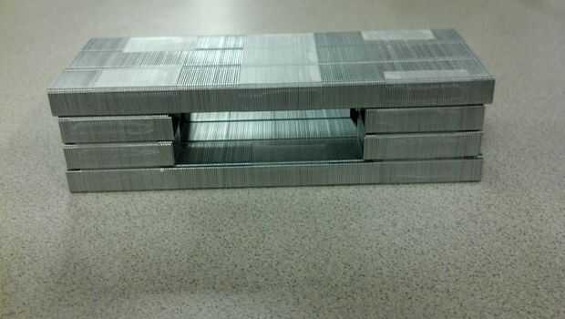 Ahora, vamos a tomar la fila inferior, que ha sido grabada juntos, y colocar la segunda fila en la parte superior, alineando las puntas y dejando un espacio en el medio. Cuando usted en la segunda fila, use su cinta y fijarlo a la fila de abajo por ir todo el camino en la parte superior y bajando por el lado para conectar a la fila inferior. Repita este paso con la 3 ª capa así. Ahora tenemos un hueco en el centro de las grapas. Una vez que las filas son todas pegadas juntas, coloque la capa superior en la parte superior, pero no asegure con cinta a las filas de la parte inferior 3.
