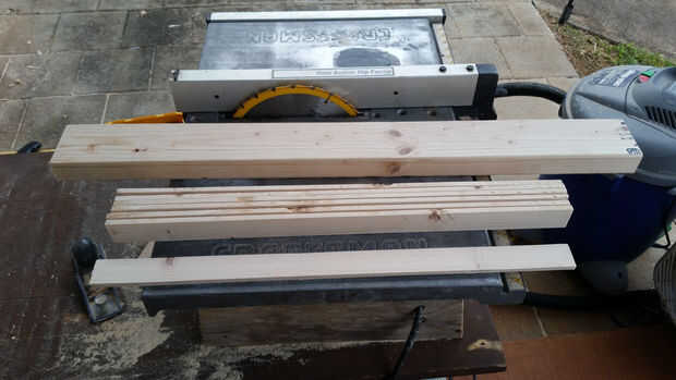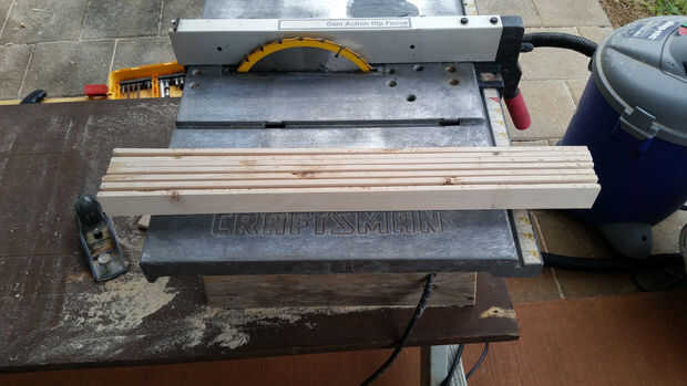Usé mi sierra de mesa para cortar 2 x 4 en las piezas del tamaño que quería. Medido el espacio que había entre la nevera y los contadores y fue poco más de 4 pulgadas. Una vez dejé el grueso que quería (aproximadamente 3/4") hice varios cortes con la tabla vio cortado a la medida.