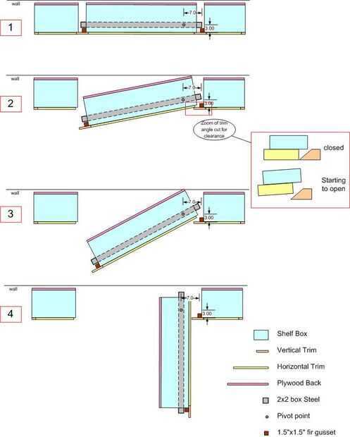He añadido un mejor dibujo de las partes fundamentales de la unidad, el centro de movimiento. Los estantes de izquierda y derecha no están a escala. Esto fue hecha con visio, que le permite ajustar el punto de rotación, por lo que pude simular los estantes para mostrar espacio libre. El archivo de visio es if adjunto puede leer. el cierre es hasta donde recortados la moldura vertical para permitir el ajuste horizontal pivotar "a través de" él.